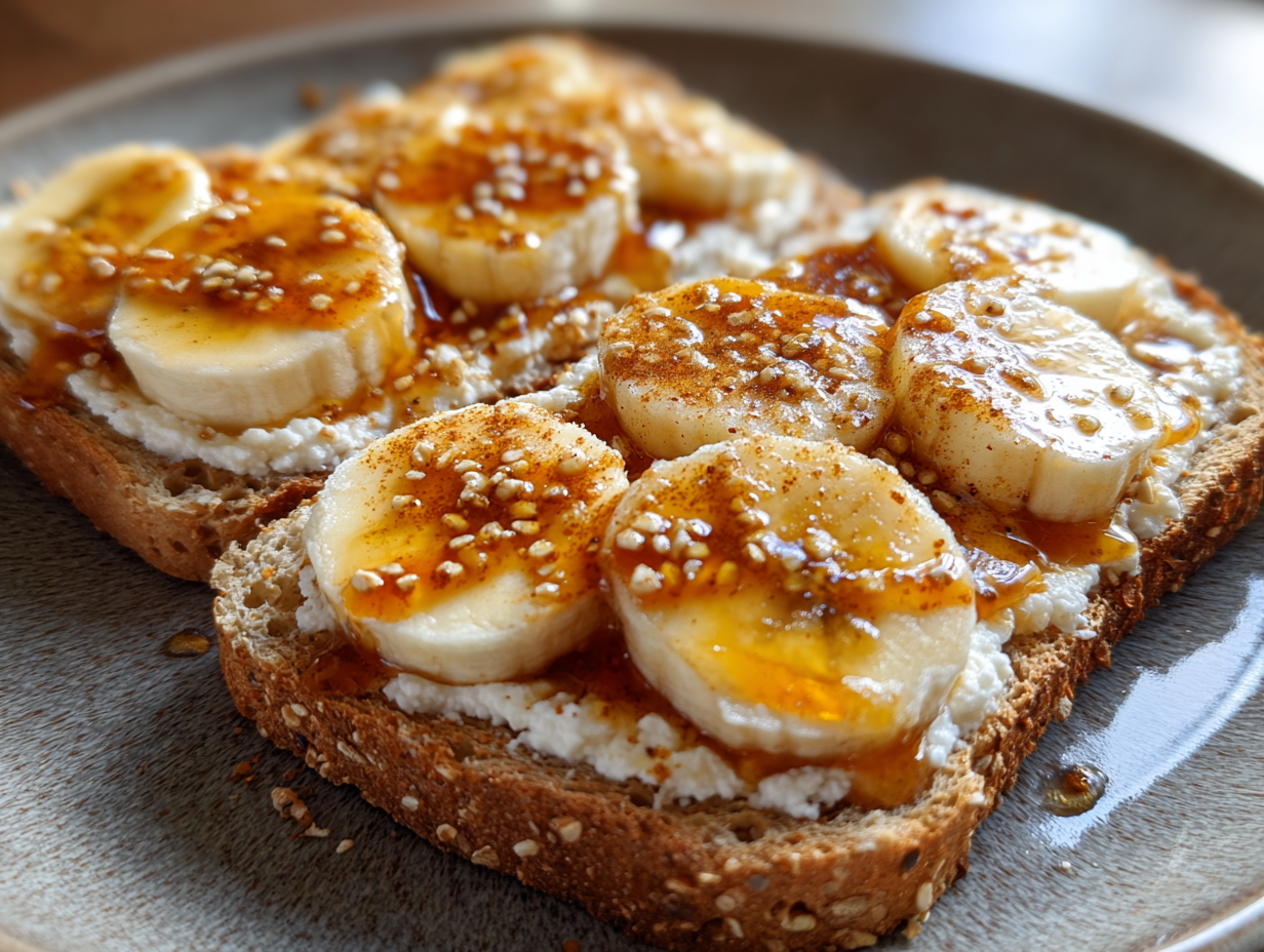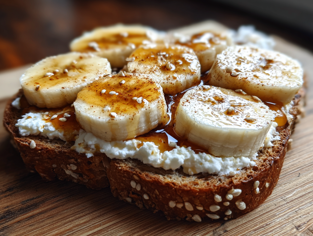 Creamy cottage cheese meets sweet banana slices on crunchy whole grain toast, drizzled with honey and dusted with warm cinnamon. A balanced breakfast packed with protein and natural sweetness, ready in 10 minutes for busy mornings or post-workout fuel.