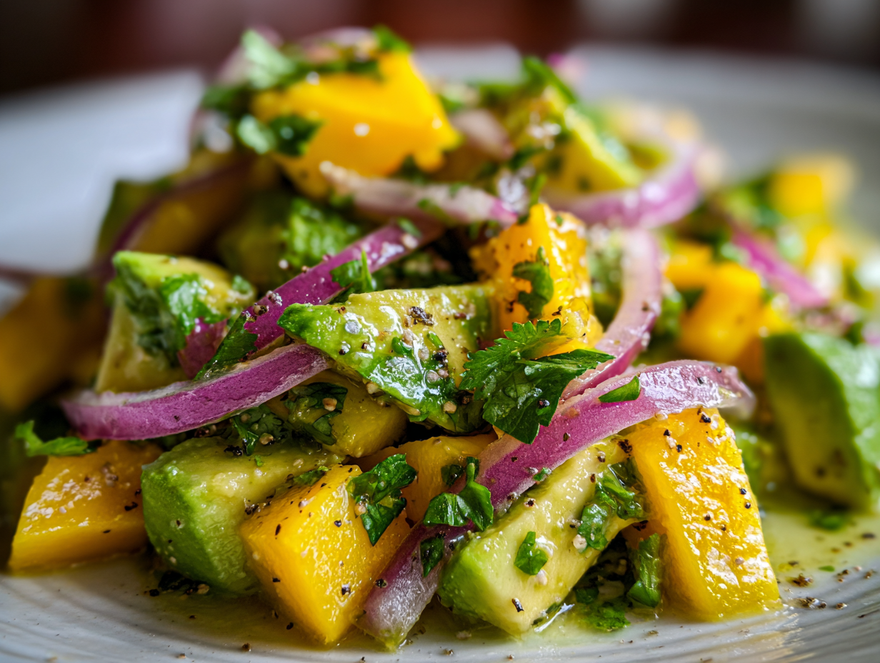 This vibrant and refreshing salad combines creamy avocado with sweet, juicy mango for a tropical flavor explosion. The bright lime dressing, crisp red onion, and fresh cilantro create a perfect balanc
