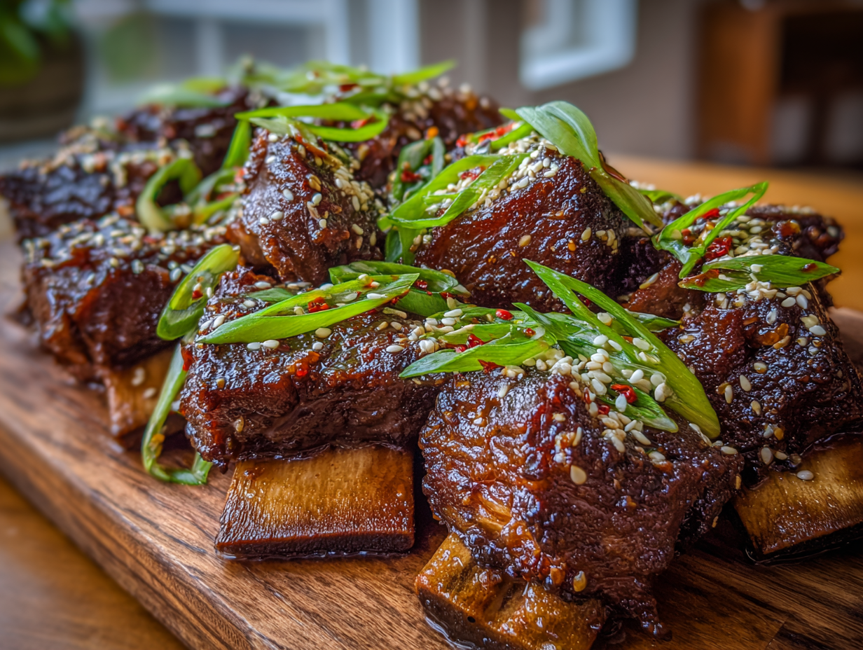 These fall-off-the-bone beef short ribs braise in a sweet-savory blend of soy, hoisin, and aromatics until caramelized and tender. The reduced glaze adds a glossy finish, perfect served over steamed r