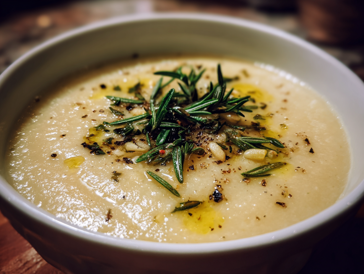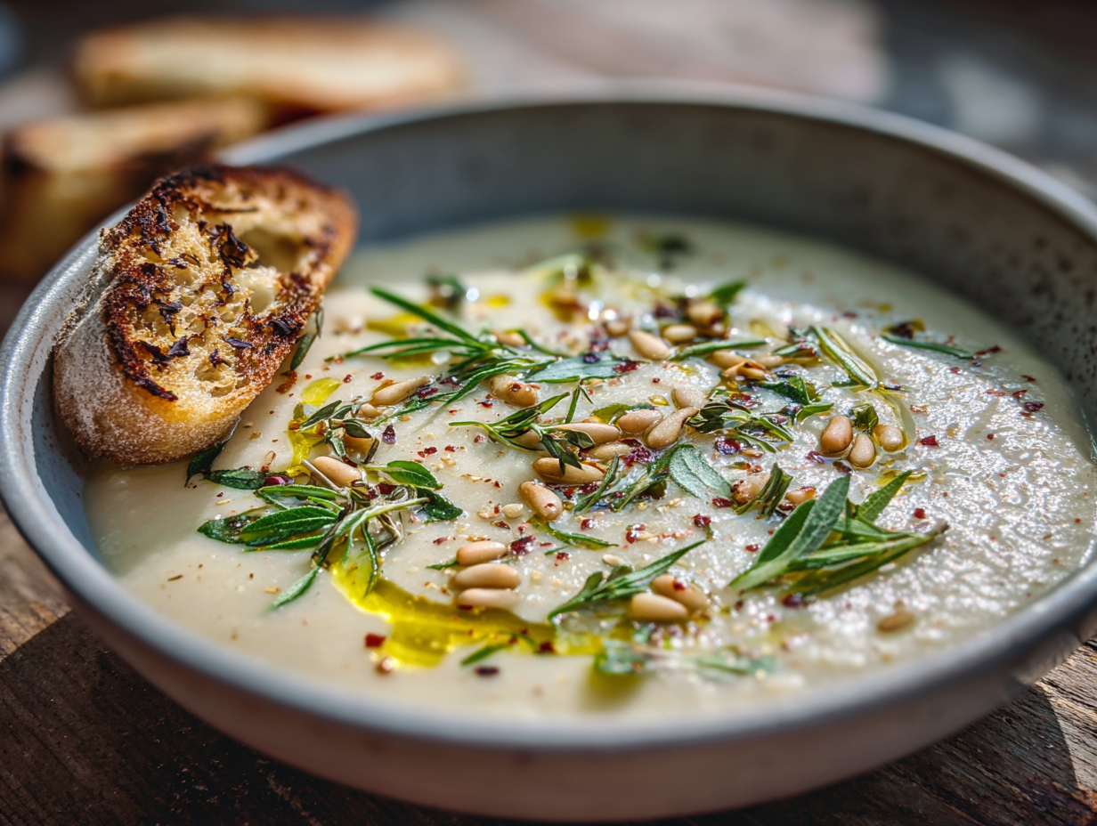 This velvety cauliflower soup is infused with fragrant Mediterranean herbs and finished with a drizzle of rich olive oil. The combination of tender cauliflower, aromatic garlic, and fresh herbs create