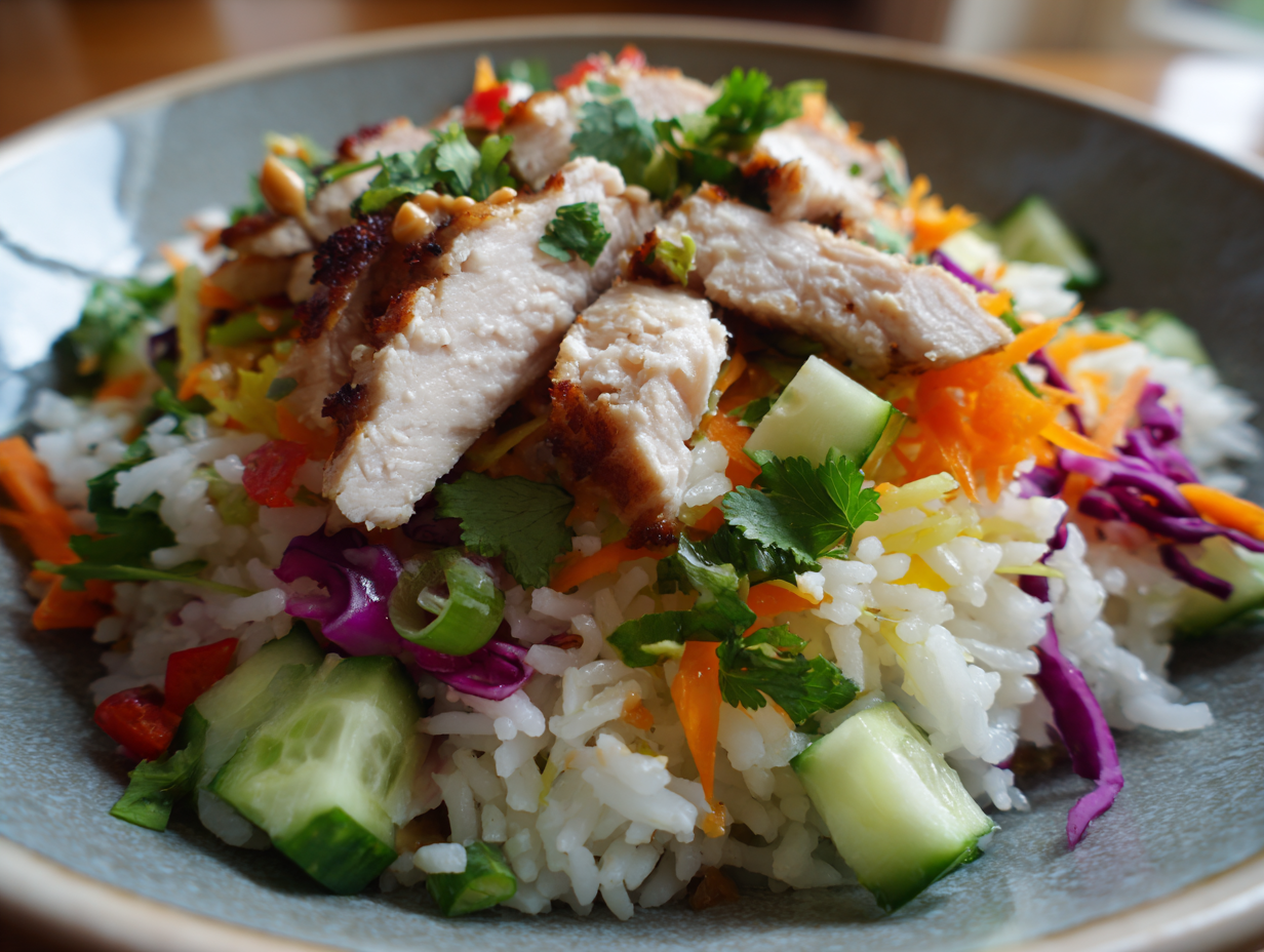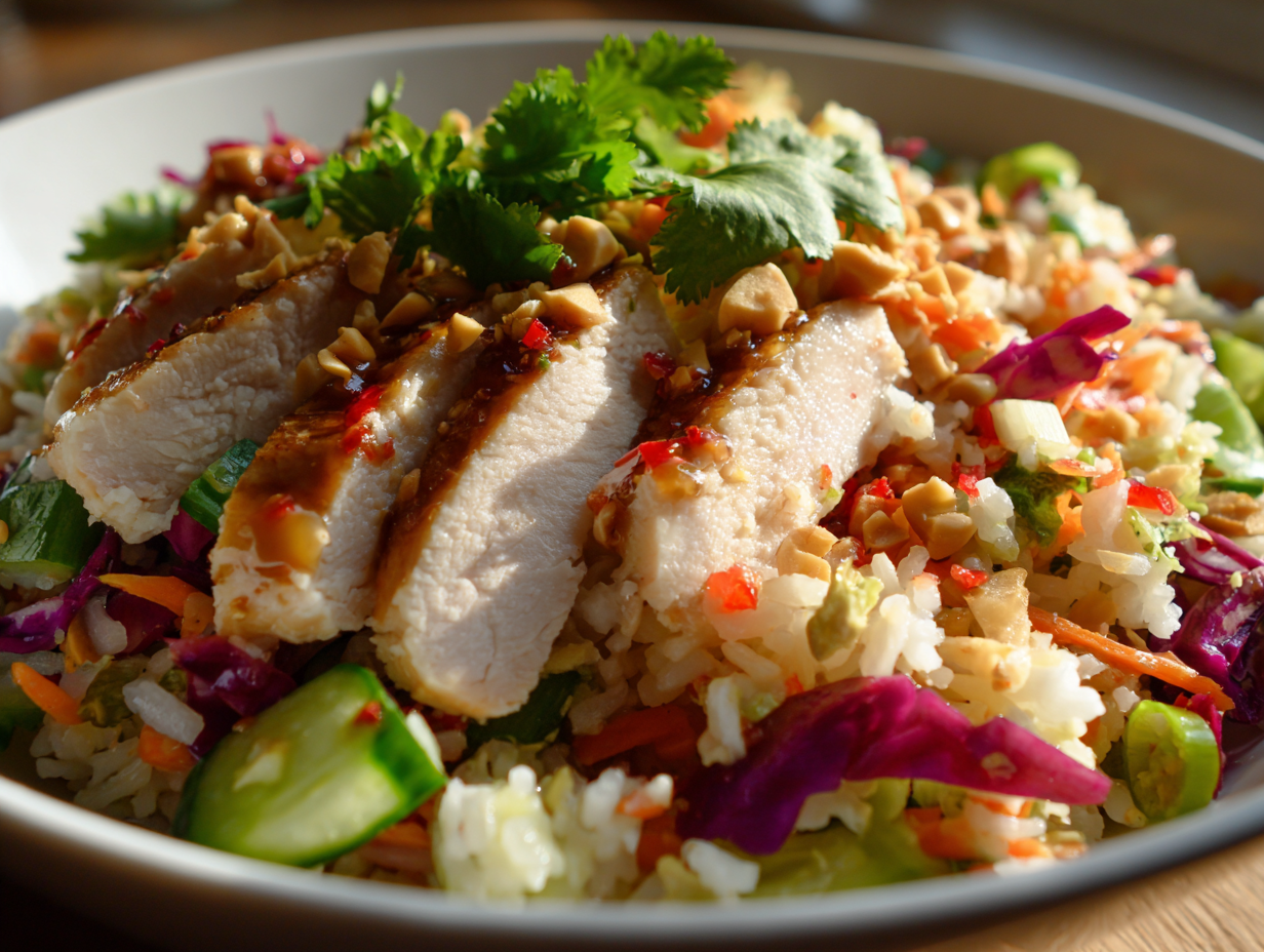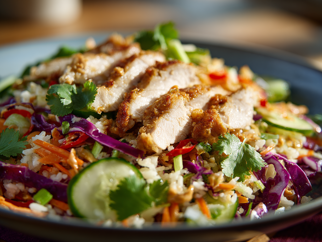 - Assemble the salad: In a large bowl, combine crispy rice, cooked chicken, red cabbage, carrots, cucumber, green onions, and cilantro.