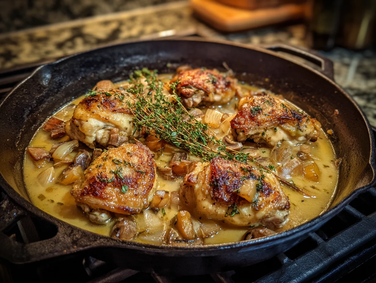 - Sear the Chicken: In a large skillet, heat the olive oil or butter over medium-high heat. Once hot, add the chicken thighs, skin-side down, and sear until golden brown, about 5-7 minutes. Flip and sear the other side for an additional 5 minutes. Remove the chicken from the skillet and set aside.