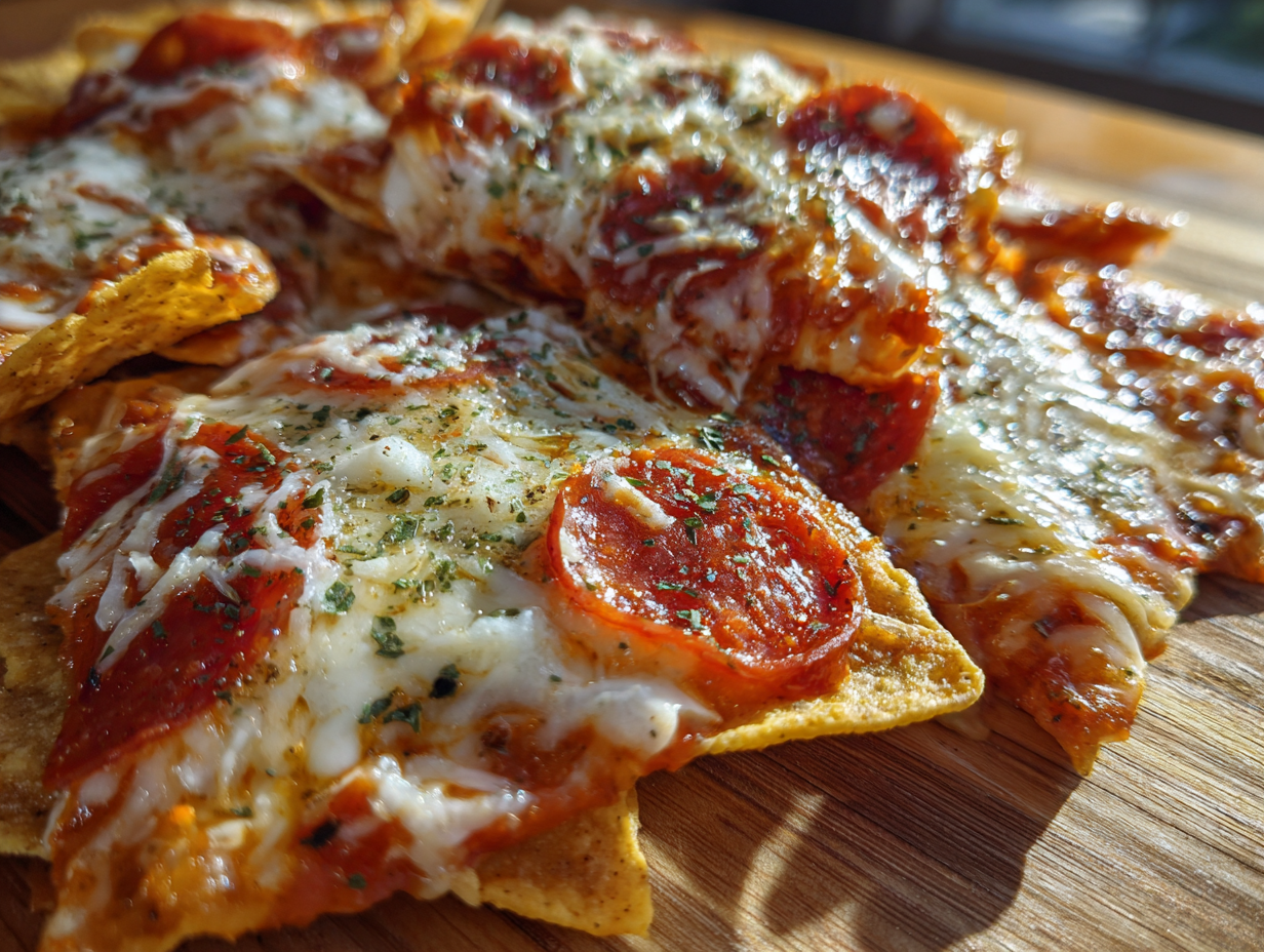 - Sprinkle shredded mozzarella evenly over the sauced chips.
