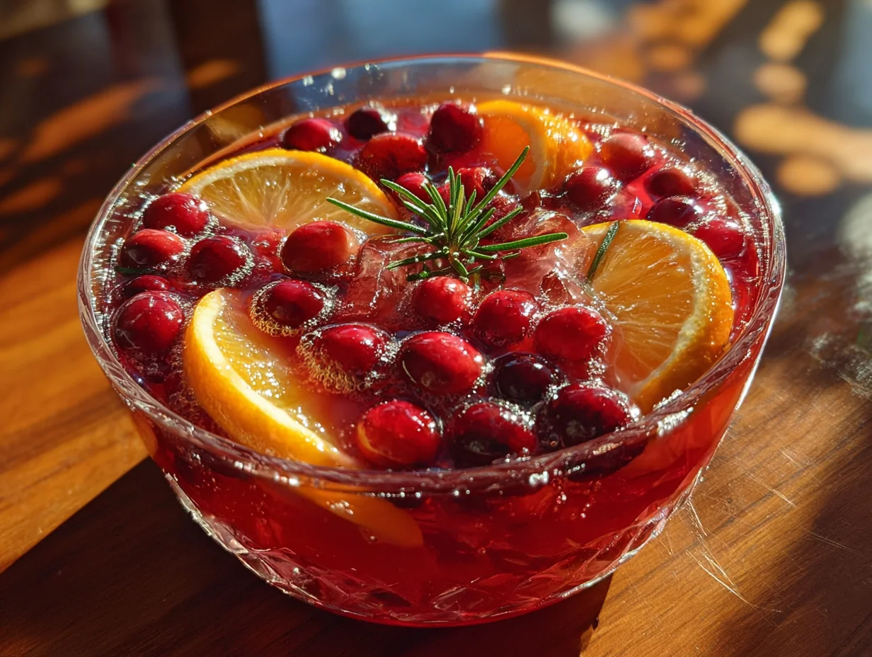 5. Garnish each glass with a slice of orange, a few fresh cranberries skewered on a toothpick, and a sprig of rosemary for a festive touch.