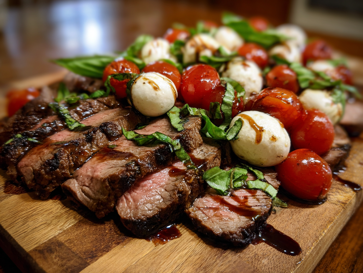 - Assemble salad: On a platter, arrange tomatoes, mozzarella, and basil. Thinly slice steak against the grain and layer over salad.