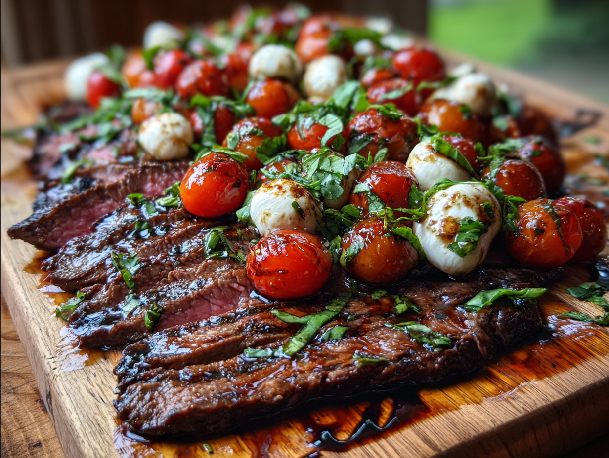 Discover how to make Grilled Flank Steak Caprese with Balsamic Dressing. A delicious recipe with detailed instructions.