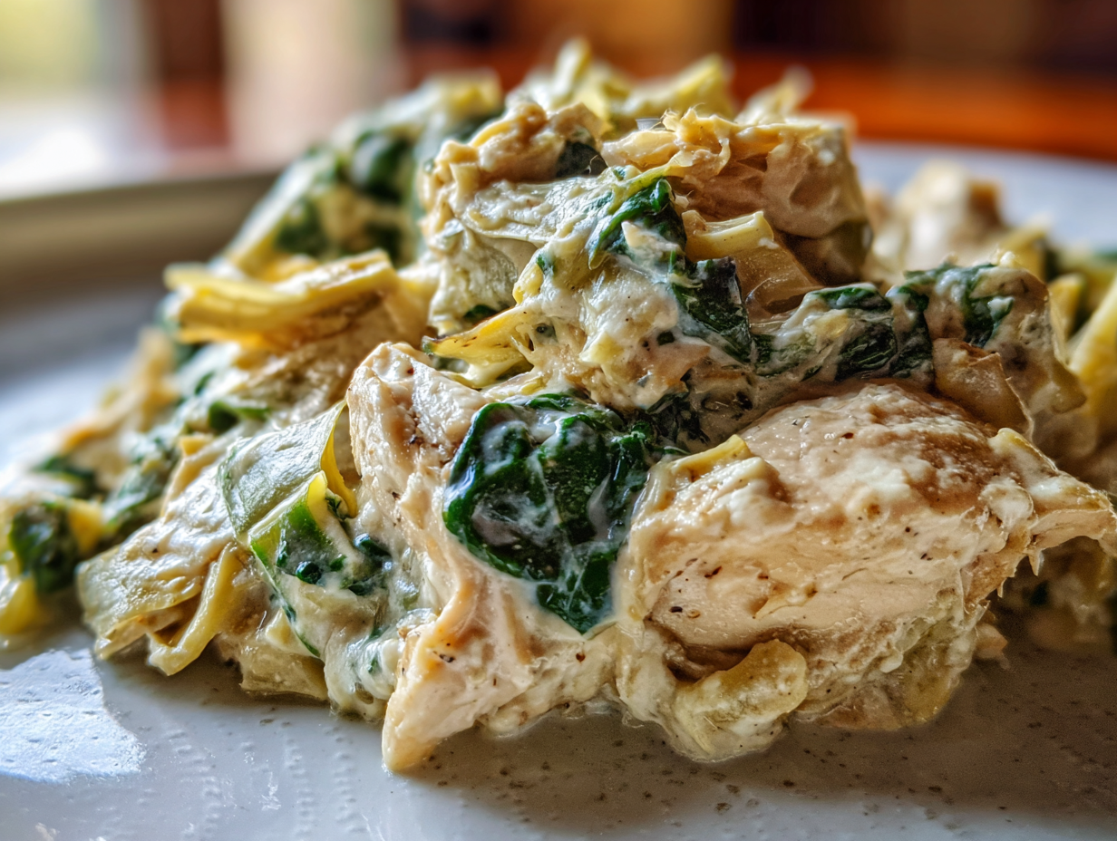 This creamy, protein-packed casserole combines tender shredded chicken with vibrant spinach and briny artichokes in a lightened-up Greek yogurt sauce. Perfect for meal prep or family dinners, it delivers restaurant-style flavor with 28g protein per serving.