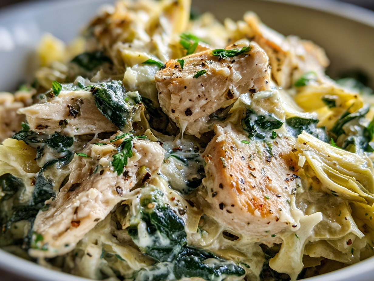 This creamy, protein-packed casserole combines tender shredded chicken with vibrant spinach and briny artichokes in a lightened-up Greek yogurt sauce. Perfect for meal prep or family dinners, it deliv