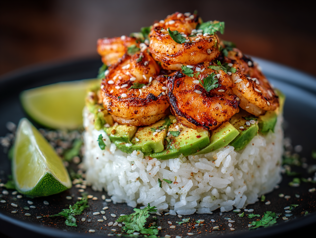 This vibrant lunch features succulent honey-lime shrimp layered over seasoned rice and creamy avocado. Sweet, tangy, and lightly spiced flavors pair perfectly with the fresh textures – ideal for a light yet satisfying meal.