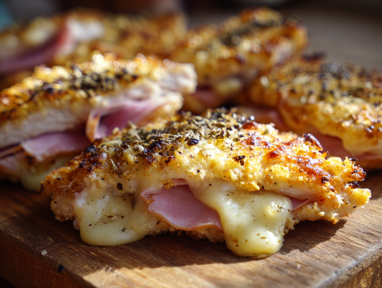 - Transfer the browned chicken to the prepared baking sheet. Top each piece with a slice of ham, then a slice of Swiss cheese.