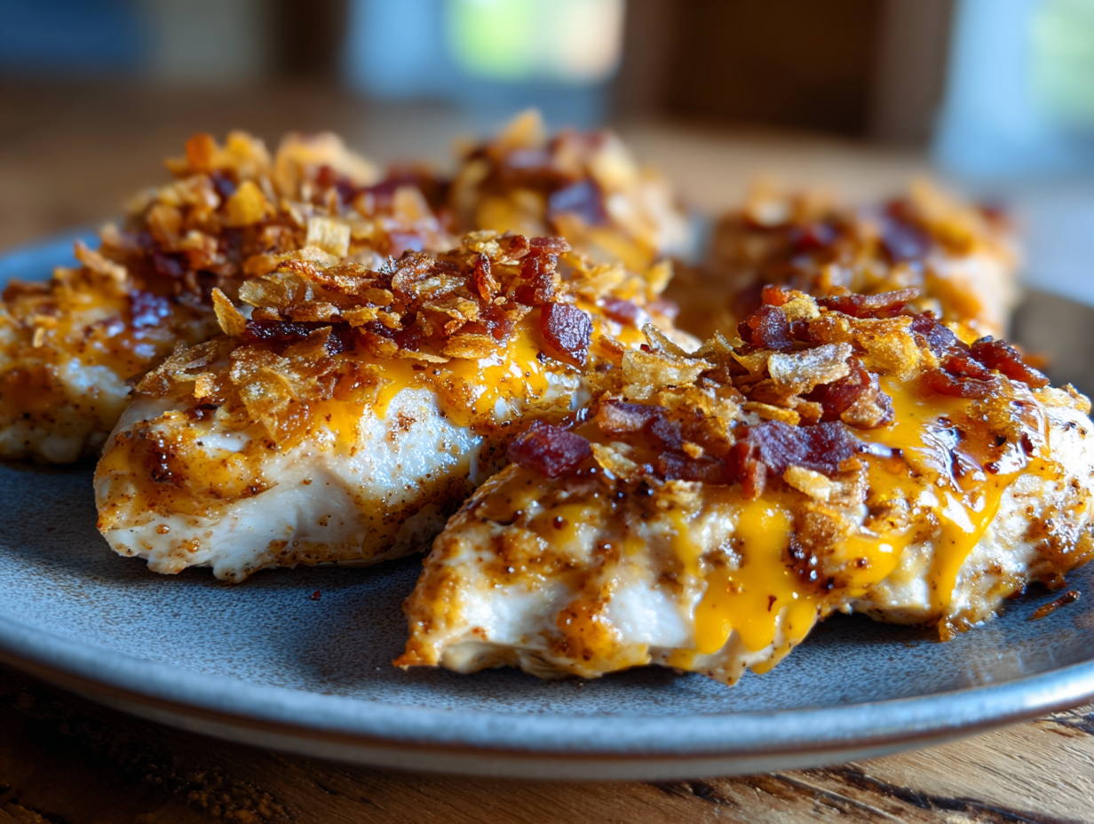 - Add toppings: Remove dish from oven and sprinkle cheese over chicken, followed by crispy onions. Return to oven for 5 minutes or until cheese melts and onions turn golden.