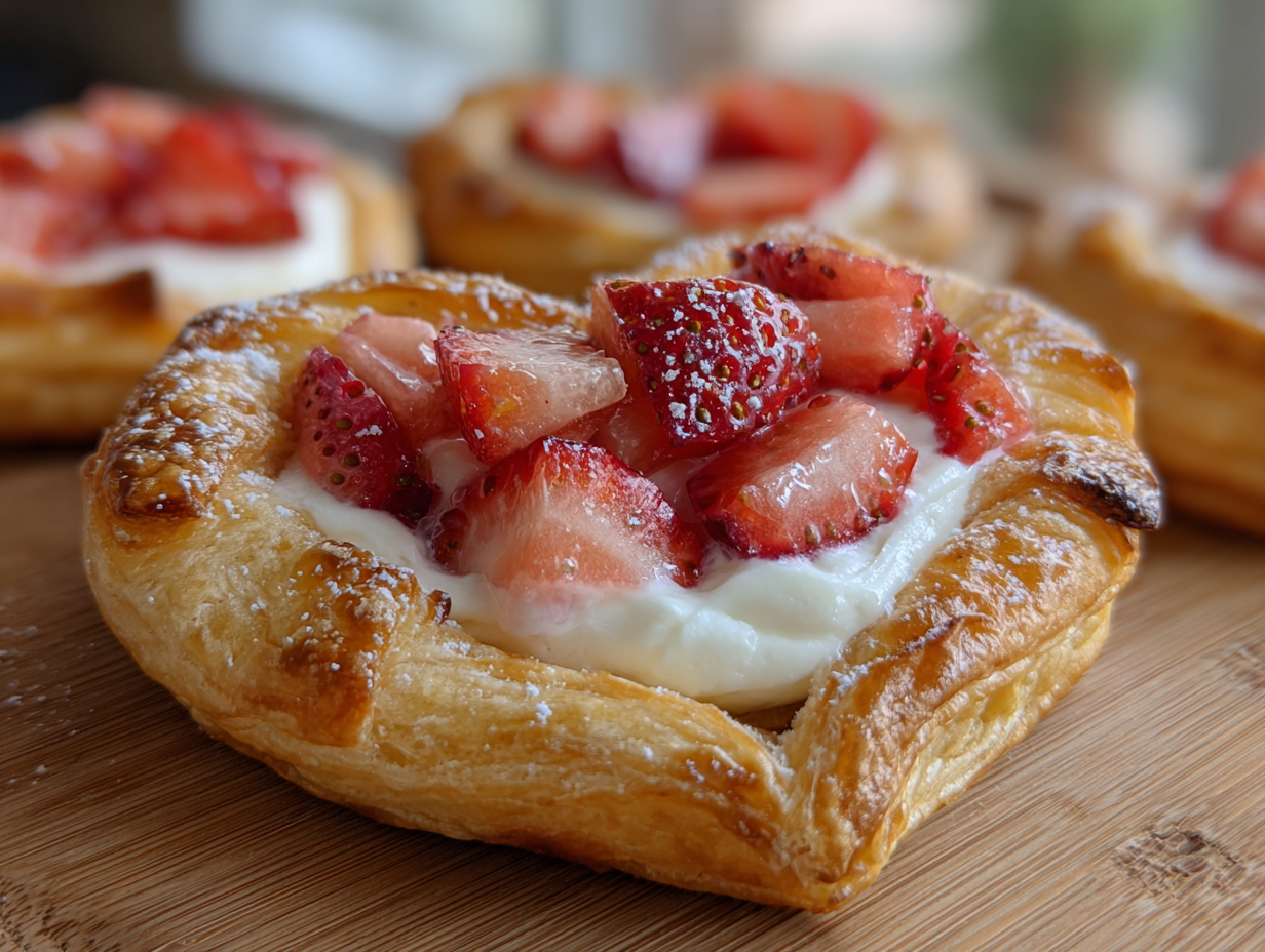 These flaky heart-shaped danishes feature a sweet cream cheese filling swirled with fresh strawberries, perfect for Valentine's Day or weekend brunch. The buttery puff pastry bakes to golden perfectio