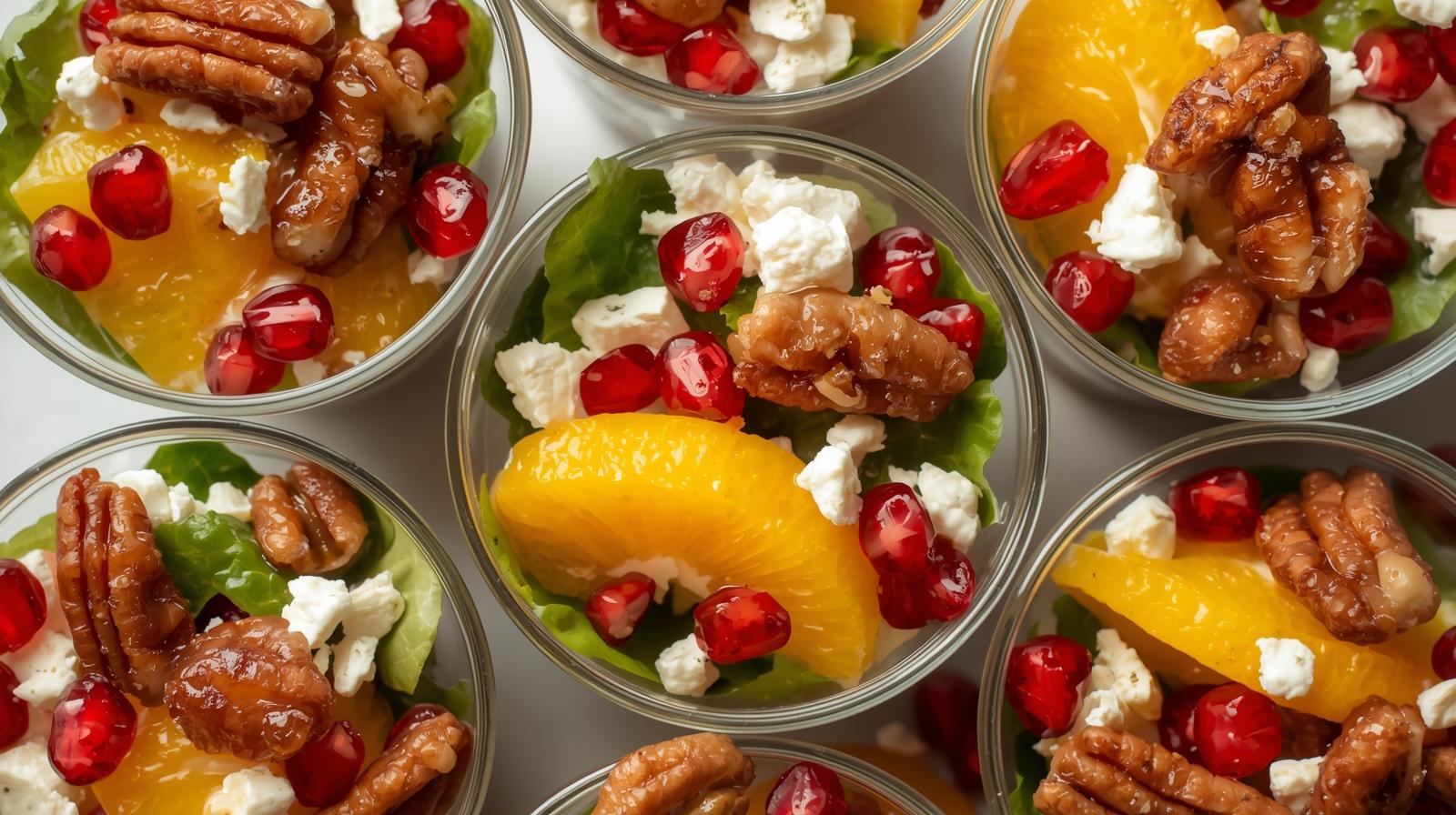 - Add the orange segments, pomegranate seeds (or dried cranberries), crumbled feta cheese, and chopped candied pecans to the bowl with the greens.